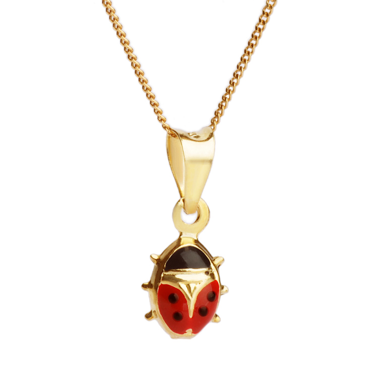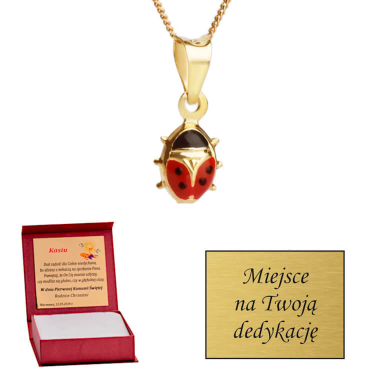 Niezwykle urocza i delikatna zawieszka złota przedstawiająca biedronkę. Dobrze sprawdzi się jako prezent na I Komunię Świętą, Roczek, Chrzciny lub inną okoliczność. Z pewnością spodoba się każdej dziewczynce. Biedronka to bardzo często spotykany, delikatny owad. Taka zawieszka to ciekawy pomysł na oryginalny prezent komunijny. Tak ważne wydarzenie wymaga pięknych dodatków.
